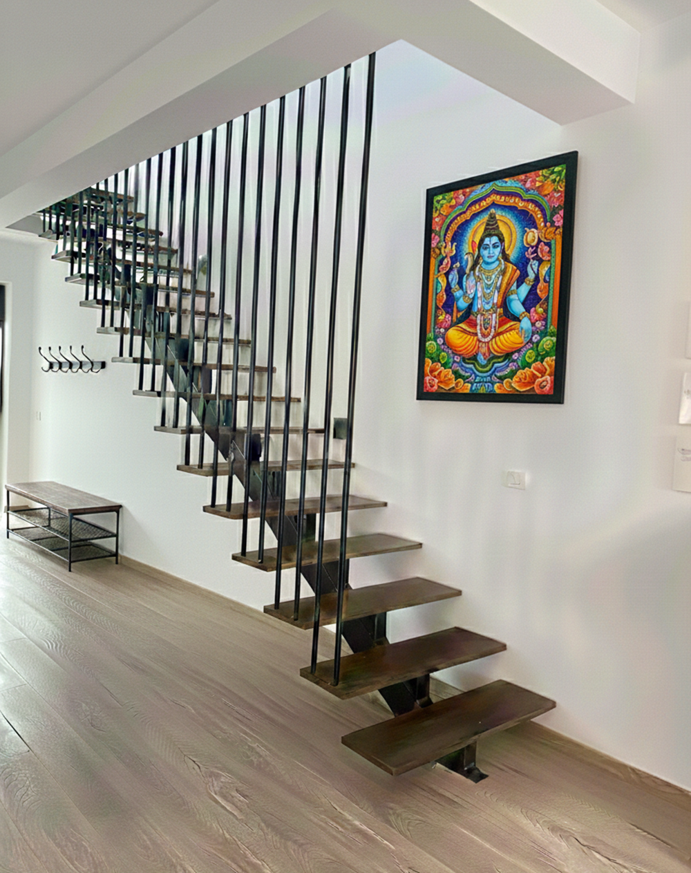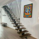 - Parterul – Inima Casei: O zona open-space spectaculoasa ce integreaza livingul, zona de dining și o bucatarie moderna, complet mobilata. Elementul central este scara pe structura metalica, o piesa de design industrial cu trepte din lemn si riflaj vertical(riflaj ce asigura si siguranta), care confera spațiului o nota de exclusivitate.