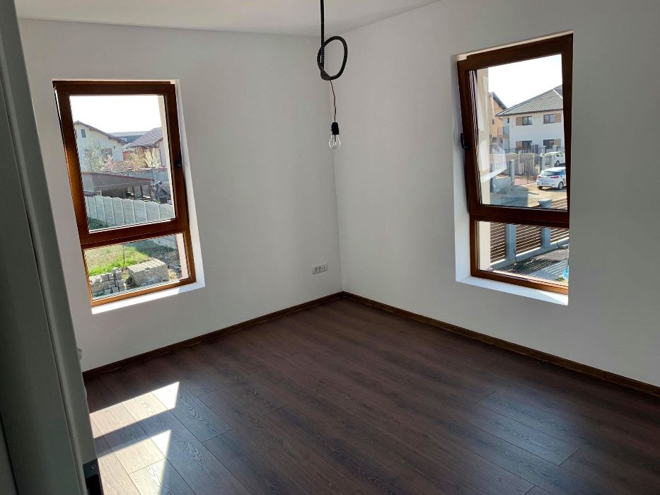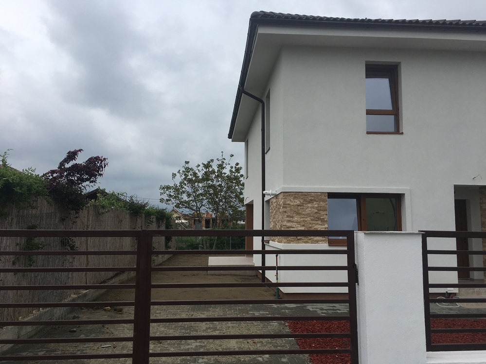 Constructia e de caramida Porotherm, izolatie exterioara de polistiren de 10 cm, acoperis de tigla BRAMAC, incalzire in pardoseala cu centrala INDESIT de 26kW. Bucataria este inchisa. Accesul pe terasa se face si din bucatarie si din livingroom. Suprafata utila este de 110 m2 iar suprafata terenului este de 330 m2, cu acces auto pe langa cladire.