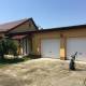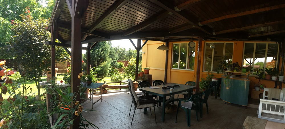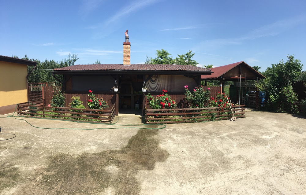 Curtea este betonata. Aici sunt un foisor pentru gratar si un carport. In spatele acestora este gradina, cu pomi fructiferi pe rod!