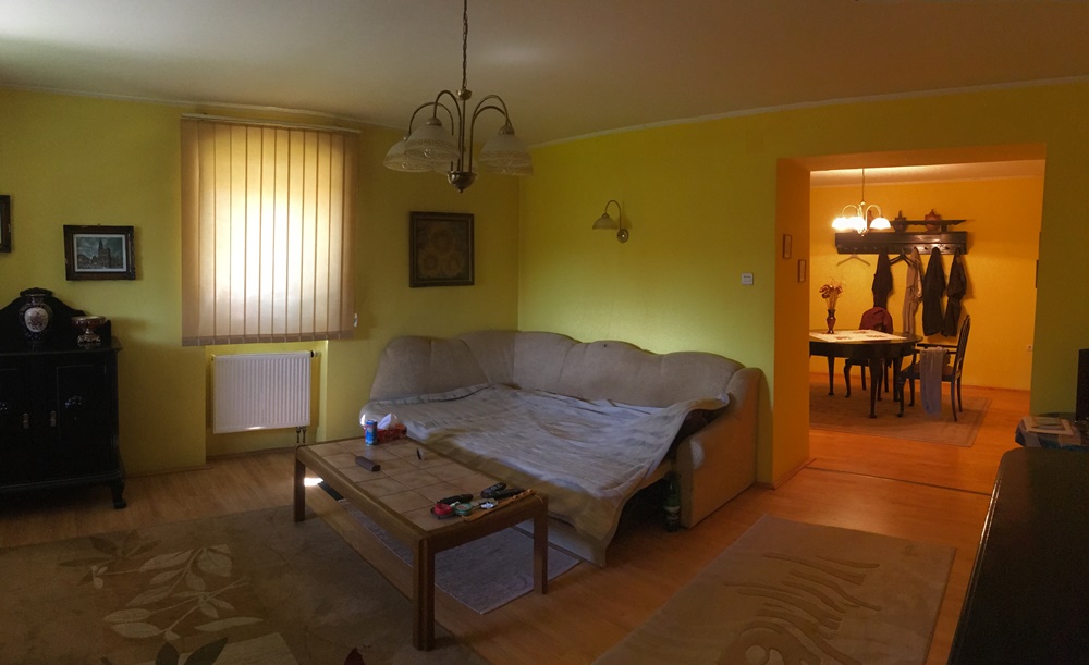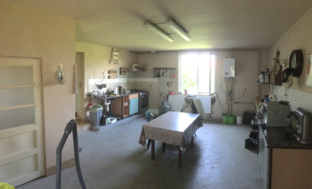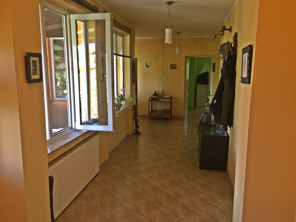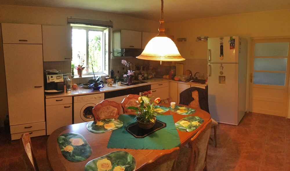Bucataria este mare, are debara in interior si mai exista inca o debara mare pe hol, unde este si accesul in pod. Holul pe unde se intra in camere, baie si bucatarie este foarte mare, cu ferestre spre terasa acoperita. Din acest hol se coboara si in crama casei.